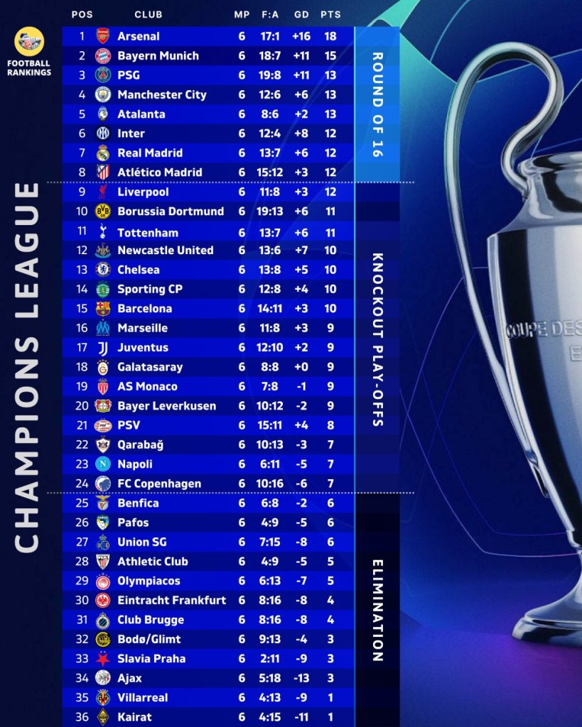 Ολοκληρώθηκε την Τετάρτη (10/12) και η 6η αγωνιστική της League Phase του Τσάμπιονς Λιγκ με τις ομάδες να κάνουν μικρή παύση καθώς τα επόμενα ματς είναι στις 20 και 21 Ιανουαρίου 2026.
