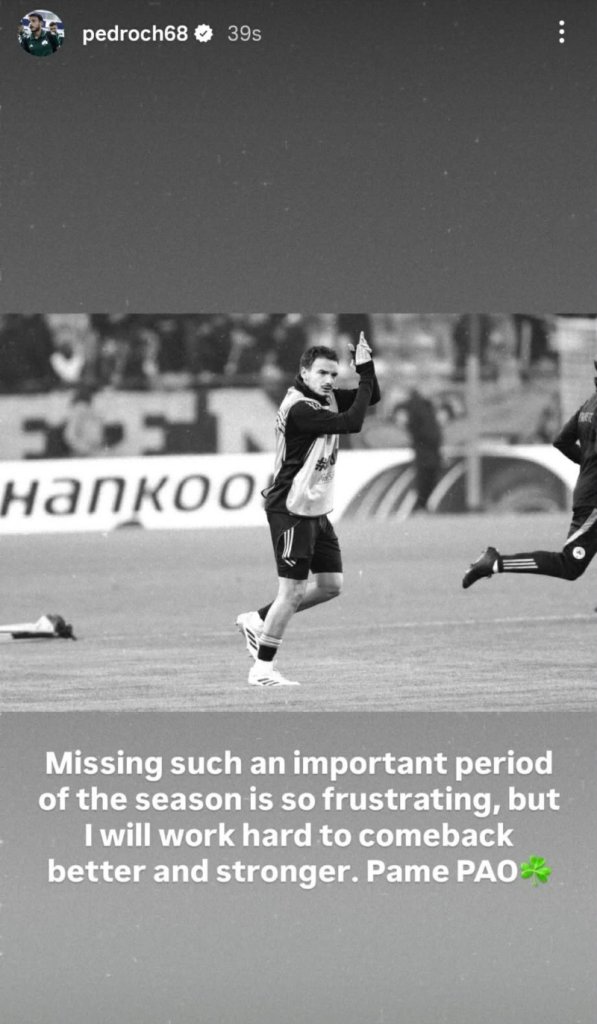 «Το να χάνεις μια τόσο σημαντική περίοδο της σεζόν είναι πραγματικά απογοητευτικό. Θα δουλέψω σκληρά για να επιστρέψω καλύτερος και πιο δυνατός. Πάμε ΠΑΟ!», έγραψε ο Ισπανός άσος.