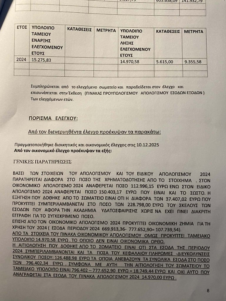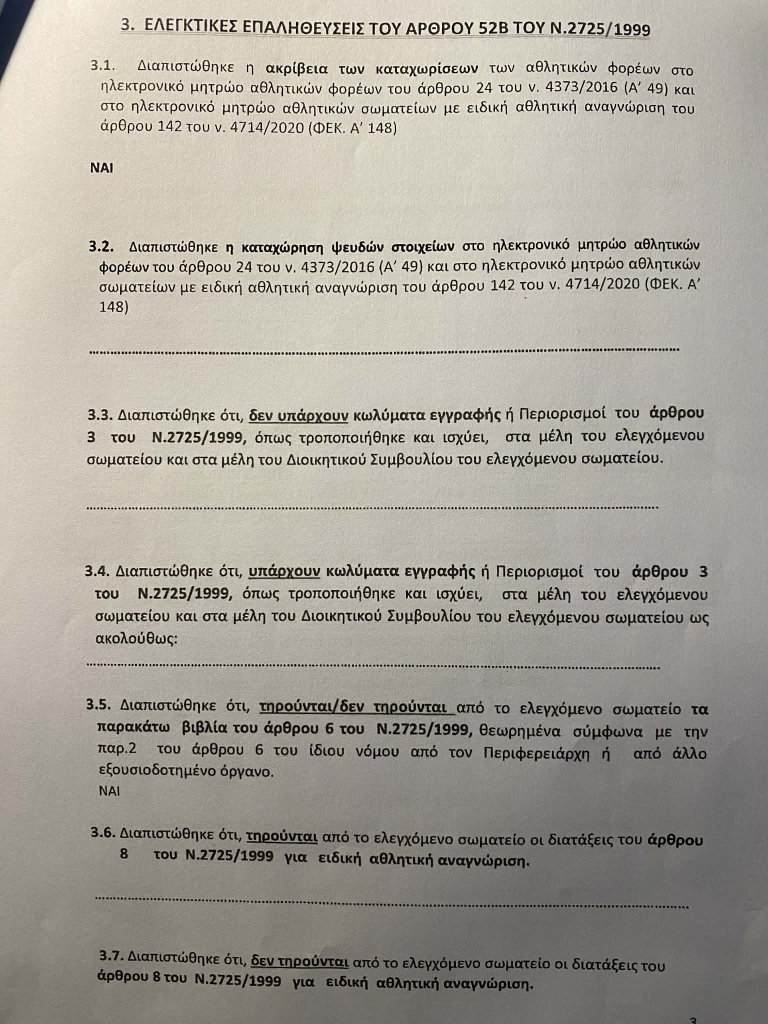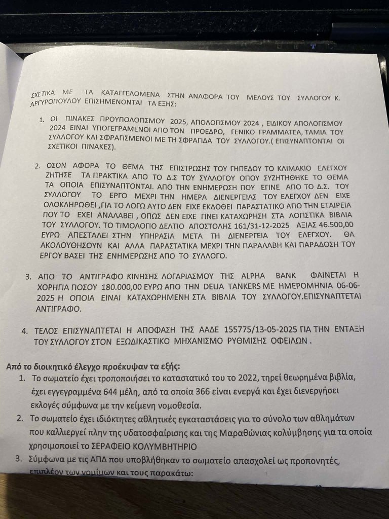 Η έκθεση της ΓΓΑ είναι καταπέλτης καθώς προκύπτουν μεταξύ άλλων παρατυπιών: «Ψευδείς καταχωρήσεις στοιχείων στο ηλεκτρονικό μητρώο αθλητικών φορέων, κωλύματα σε απλά μέλη και μέλη του Δ.Σ., οικονομικές διαφορές (πάνω από 37.000 ευρώ) και λάθη (όπως το ταμειακό υπόλοιπο) στον απολογισμό του 2024…». Πέραν αυτών, υπήρχαν και έξι προπονητές που ήταν είτε με ληγμένη άδεια είτε χωρίς καν άδεια άσκησης επαγγέλματος!