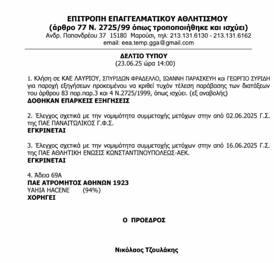 Εν τω μεταξύ, η ΕΕΑ ενημέρωσε πως εγκρίνεται τόσο η νομιμότητα συμμετοχής μετόχων στην ΠΑΕ ΑΕΚ όσο και στην ΠΑΕ Παναιτωλικός.