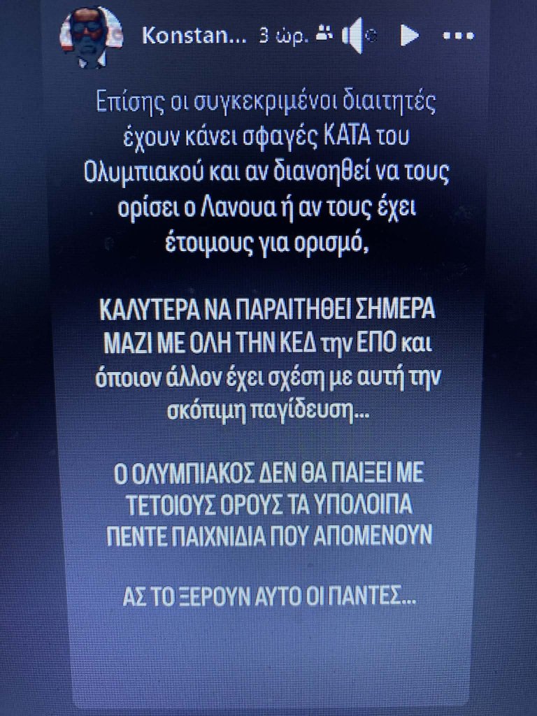 Σε νέο story ο Καραπαπάς τόνισε πως οι συγκεκριμένοι διαιτητές έχουν αδικήσει τον Ολυμπιακό και πως αν τους ορίσει ο Λανουά ή τους έχει έτοιμους καλύτερα να παραιτηθεί, ενώ ξεκαθάρισε πως ο Ολυμπιακός δεν θα παίξει με αυτούς τους όρους τα υπόλοιπα πέντε ματς που απομένουν και πως αυτό θα πρέπει να το καταλάβουν οι πάντες (ΦΩΤΟ 3).