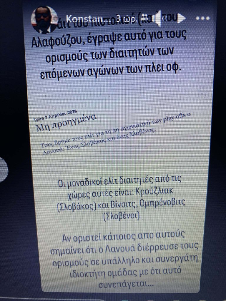 Συγκεκριμένα, ο Καραπαπάς ανέφερε πως σε κανάλι ιδιοκτήτη ΠΑΕ, ειπώθηκε πως η ΚΕΔ πρόκειται να ορίσει έναν Σλοβάκο και έναν Σλοβένο στα δύο ντέρμπι. Οι μοναδικοί που ανήκουν στην κατηγορία Elite από αυτές τις χώρες είναι ο Ιβάν Κρούζλιακ (Σλοβακία) και οι Σλάβκο Βίντσιτς, Ράντε Ομπρένοβιτς (Σλοβενία) (ΦΩΤΟ 2).